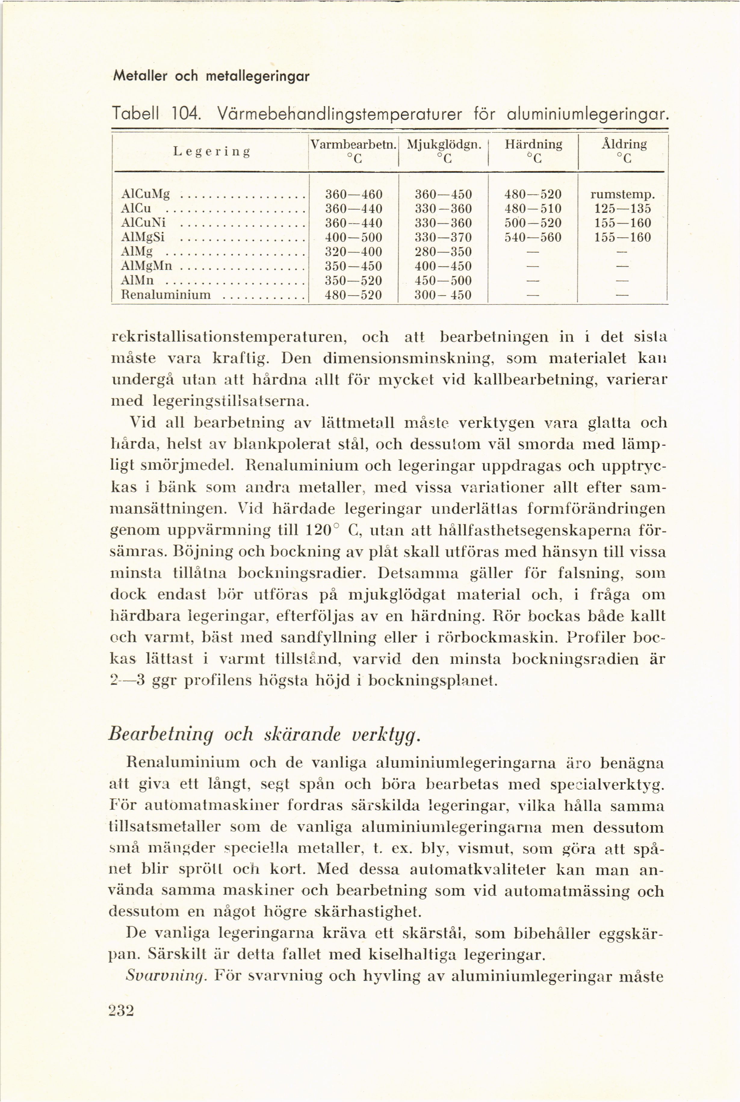 Tabell 104. Värmebehandlingstemperaturer för aluminiumlegeringar.