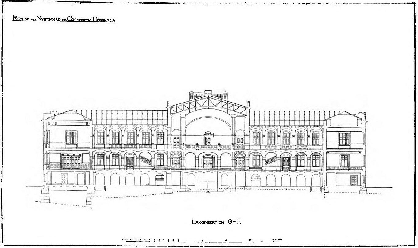 Ritning till Nybyggnad för Göteborgs Högskola. Längdsektion G-H sektion g–h |