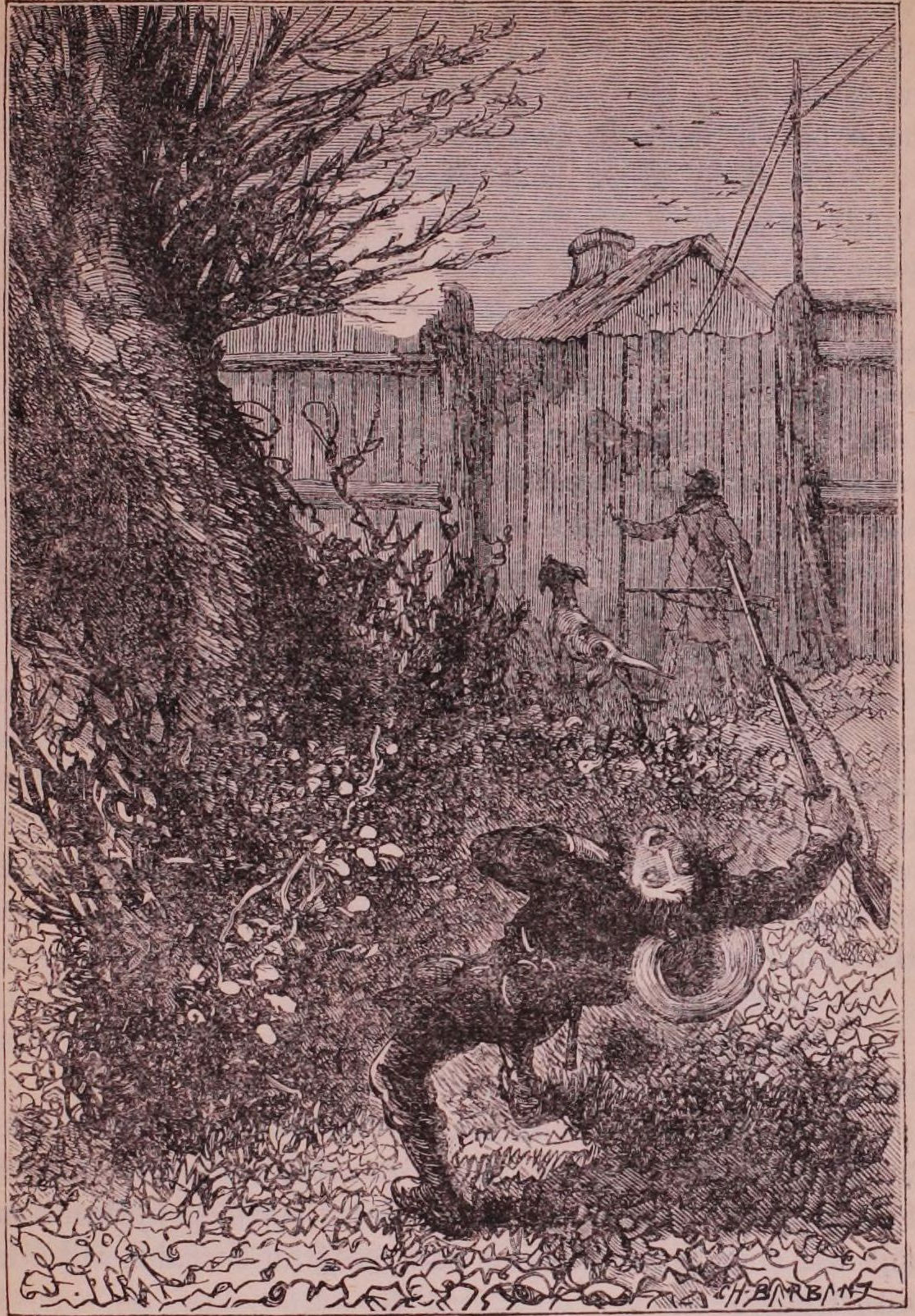 | Ett skott smälde öfver palissaden (sid. 596). |