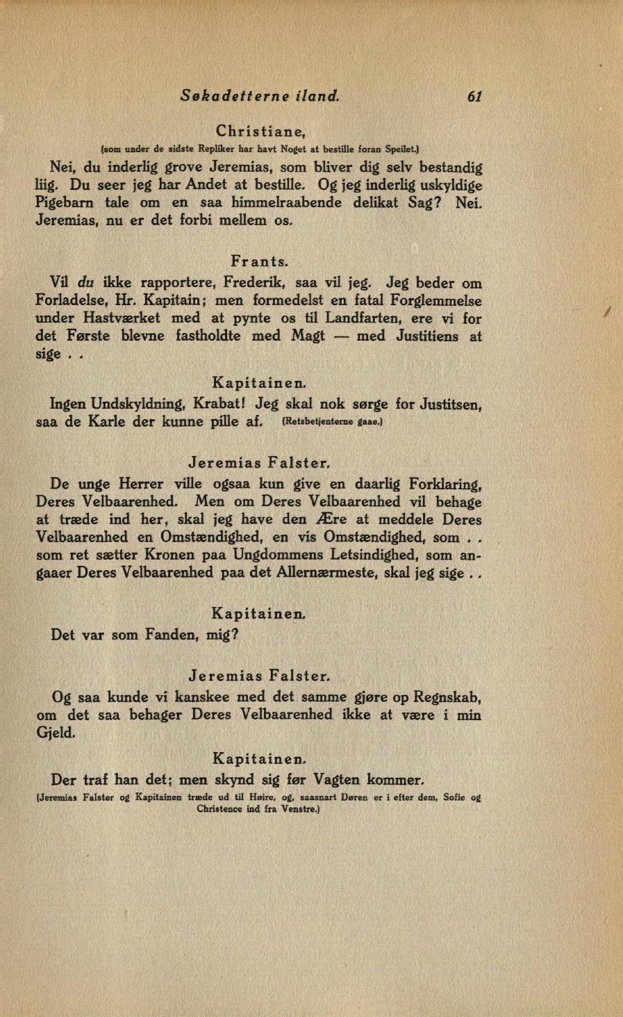 (Jeremias Falster og Kapitainen træde ud til Høire, og, saasnart Døren er i efter dem, Sofie og