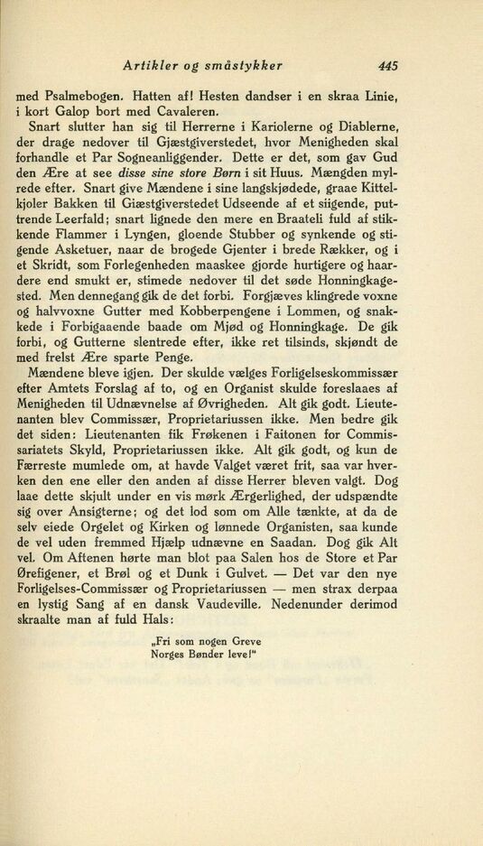 med Psalmebogen. Hatten af! Hesten dandser i en skråa Linie,