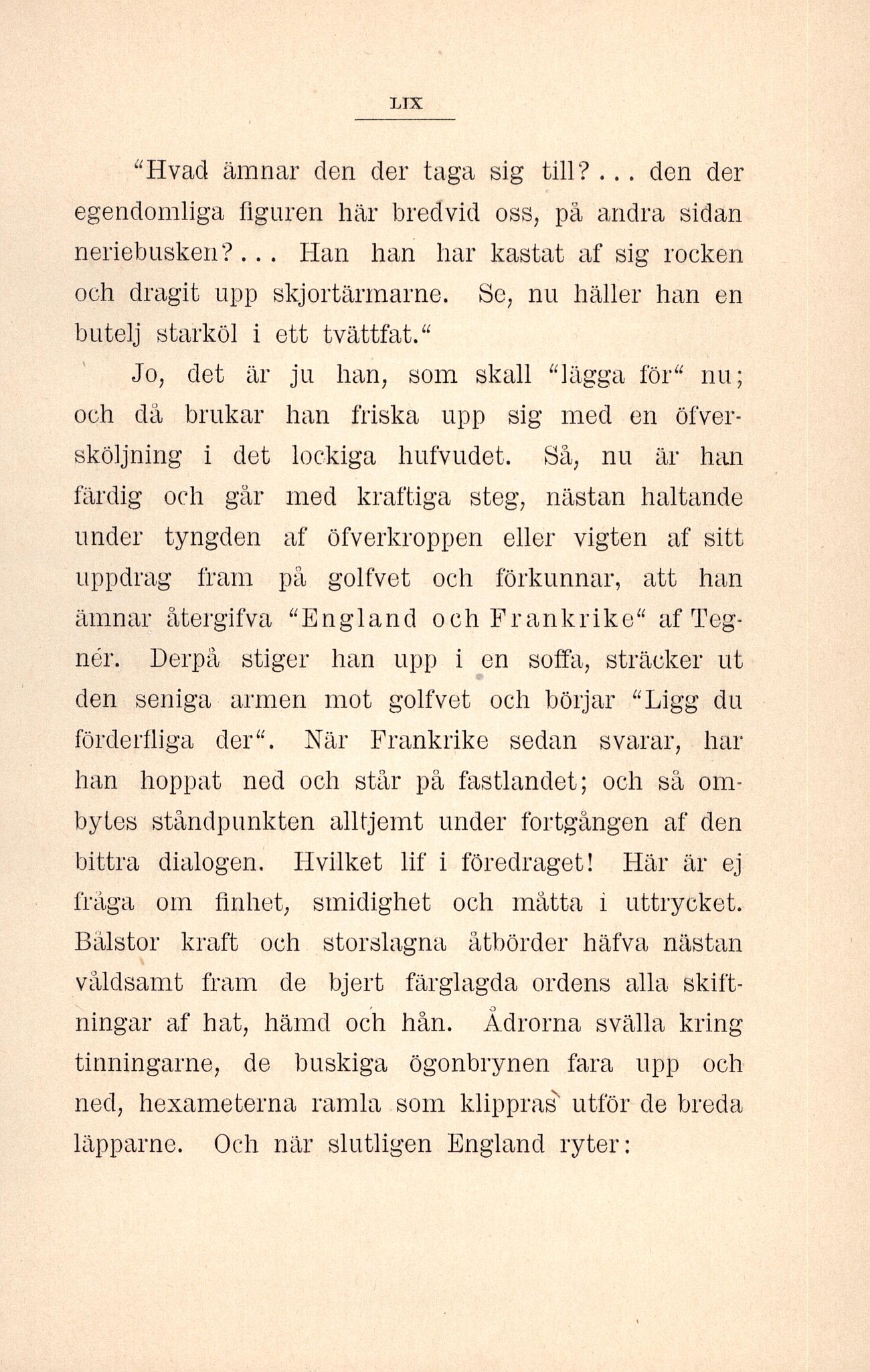Tegnér. Derpå stiger han upp i en soffa, sträcker ut