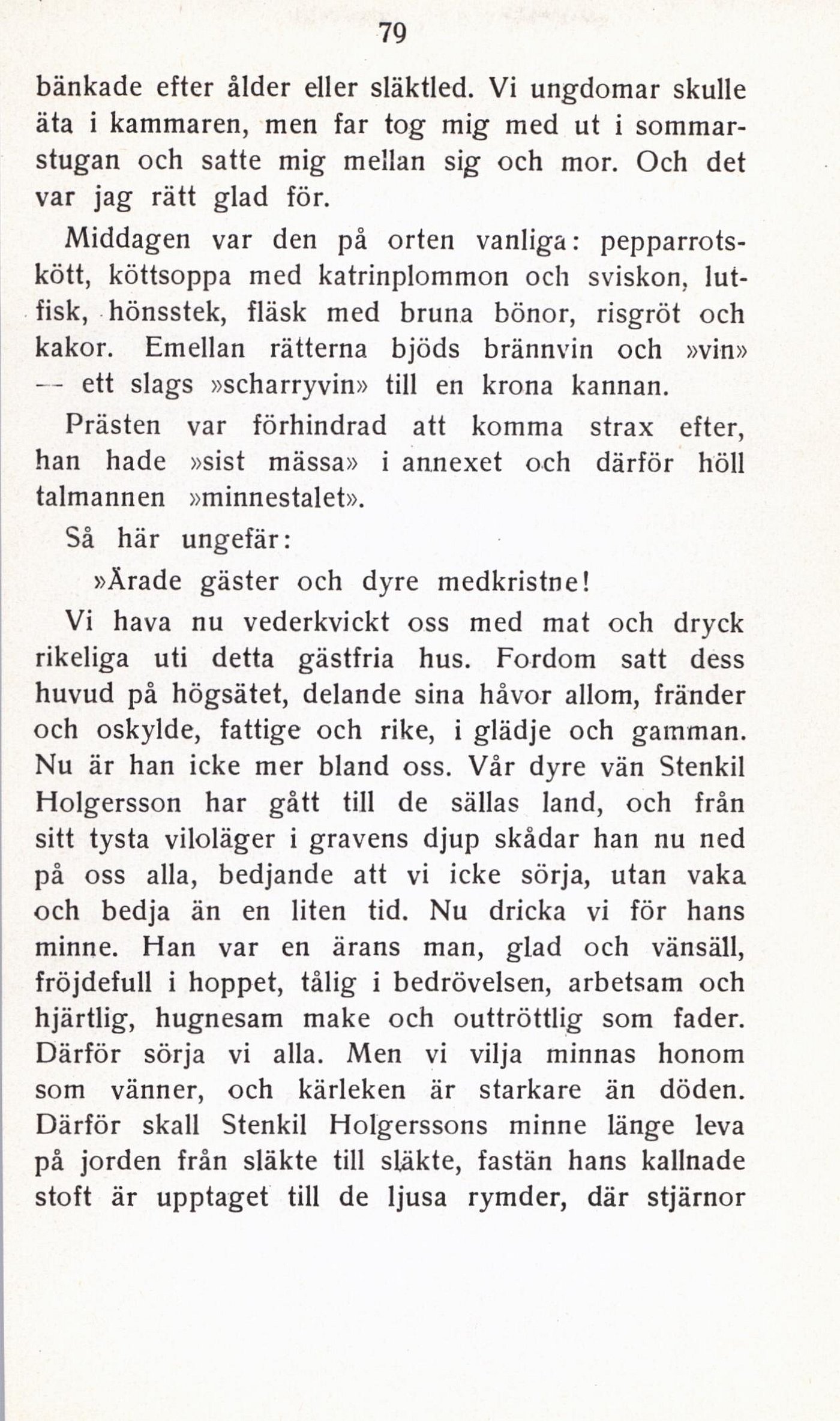 kakor. Emellan rätterna bjöds brännvin och »vin»