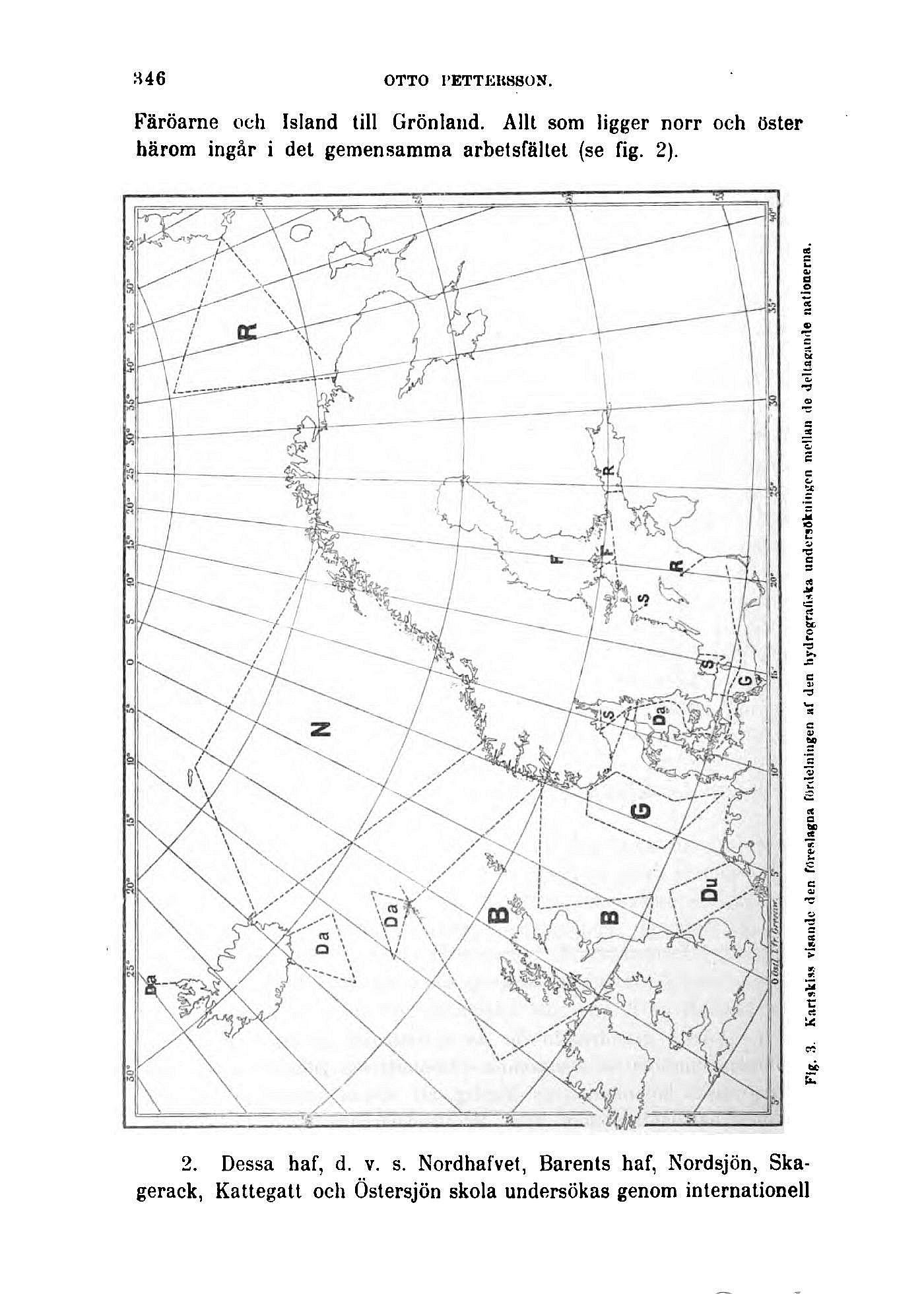 Flg. 3. Kartskiss visande den föreslagna fordelningen af den hydrografiska undersökningen mellan de deltagande nationerna.