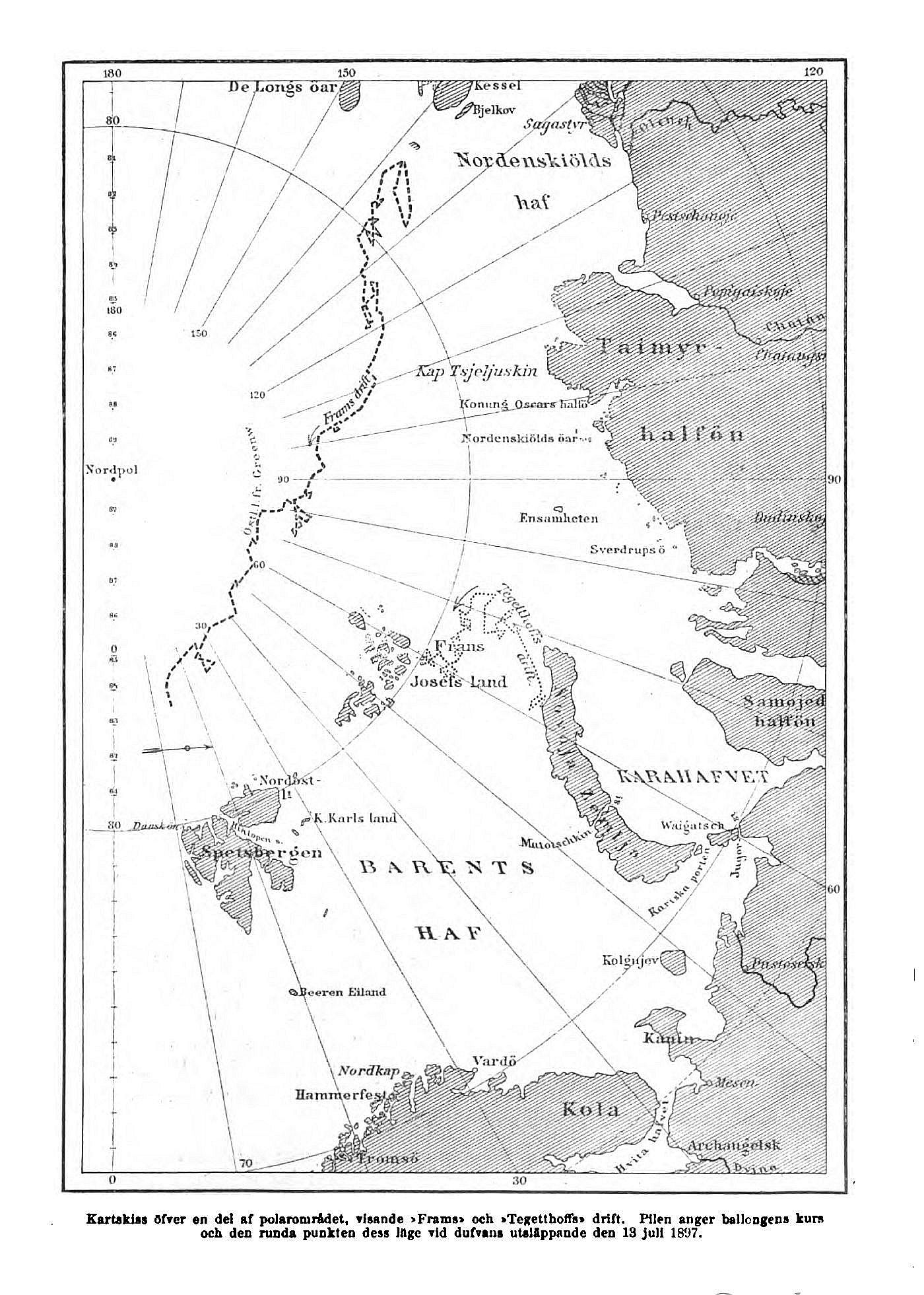 Kartskiss öfver en del af polaromr&det, kisande >Frams> och »Tegetthoffs» drift. Pilen anger b&llcngens kurs