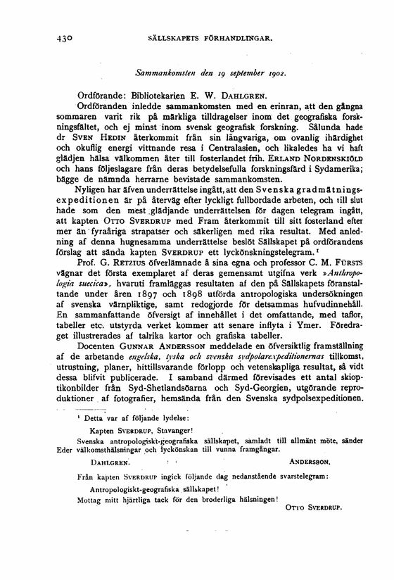 Svenska antropologiskt-geografiska sällskapet, samladt till allmänt möte, sänder