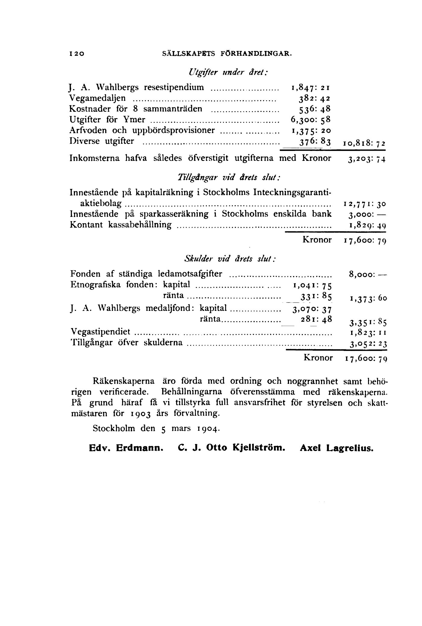 behörigen verificerade. Behållningarna öfverensstämma med räkenskaperna.