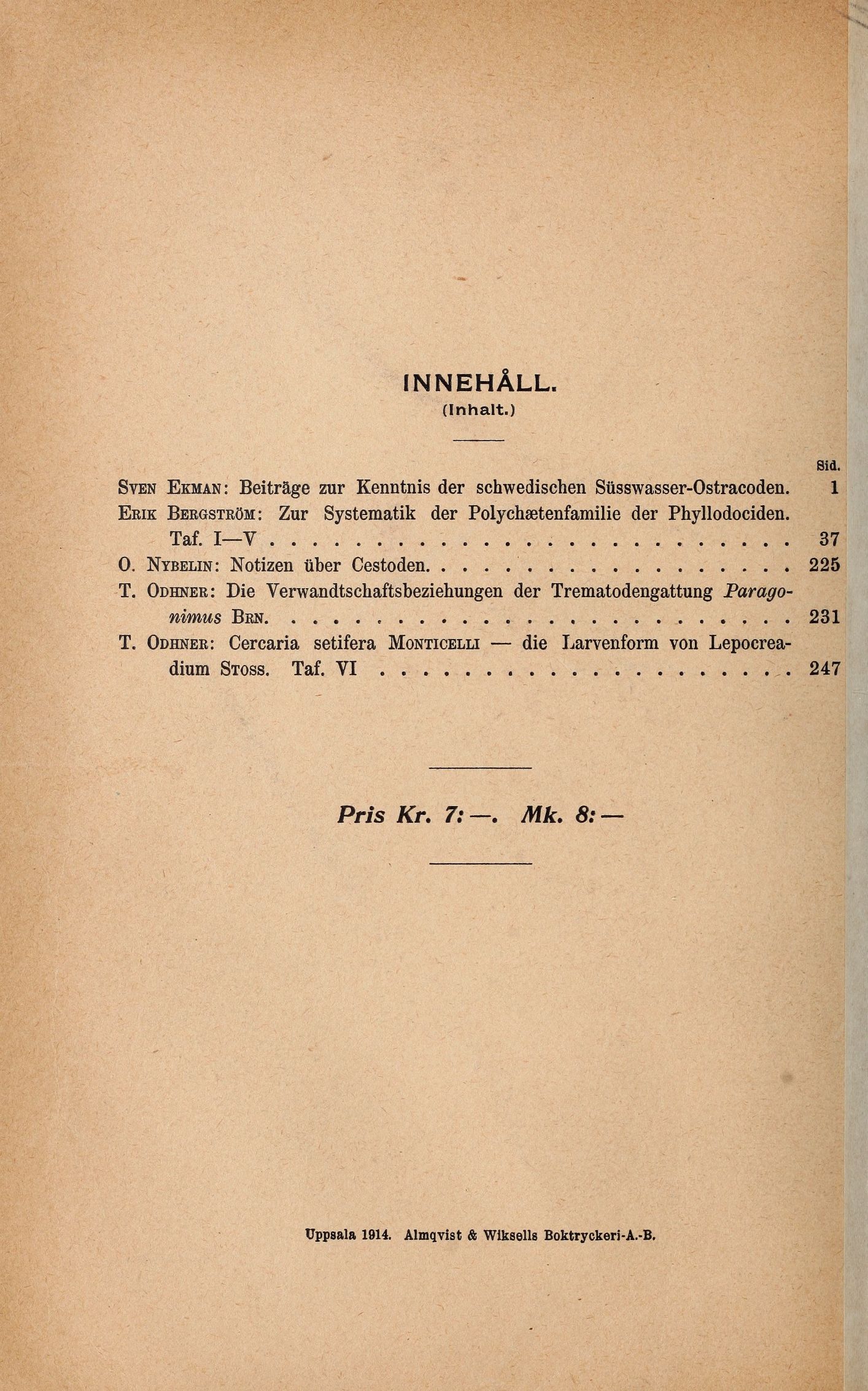 0. Nybelin: Notizen über Cestoden..............................................225